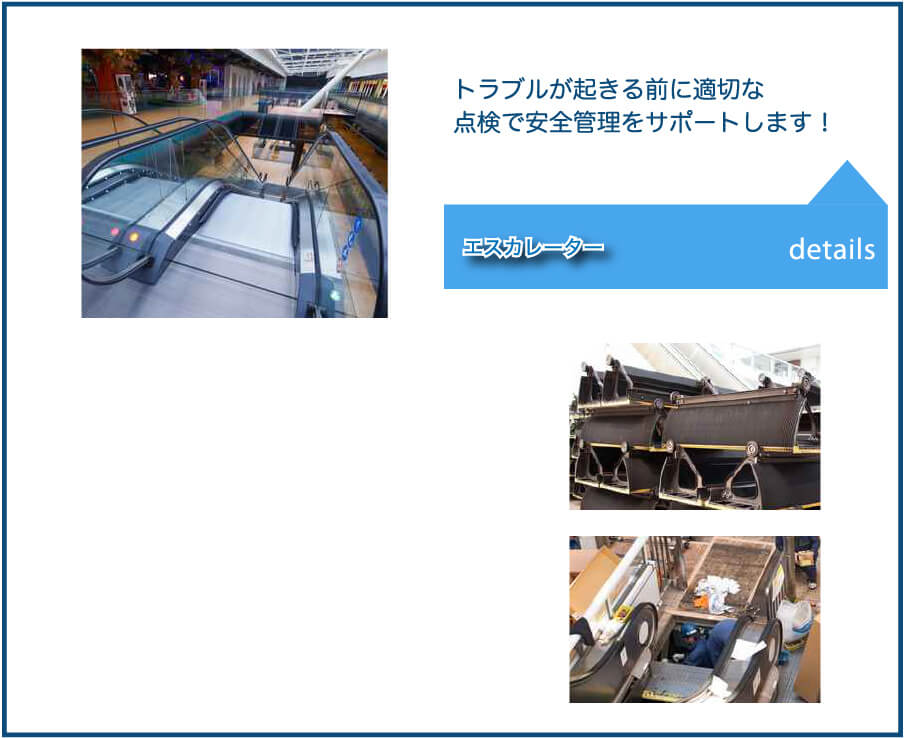適切な管理、定期的な点検、定期検査を正しく行う事により、毎日の安全と快適な運行を可能にします。長期にわたり安全維持する為には高度で広範囲な専門知識を持った専門技術者に任せる事で機能の維持と運行の安全確保を継続させることができます。